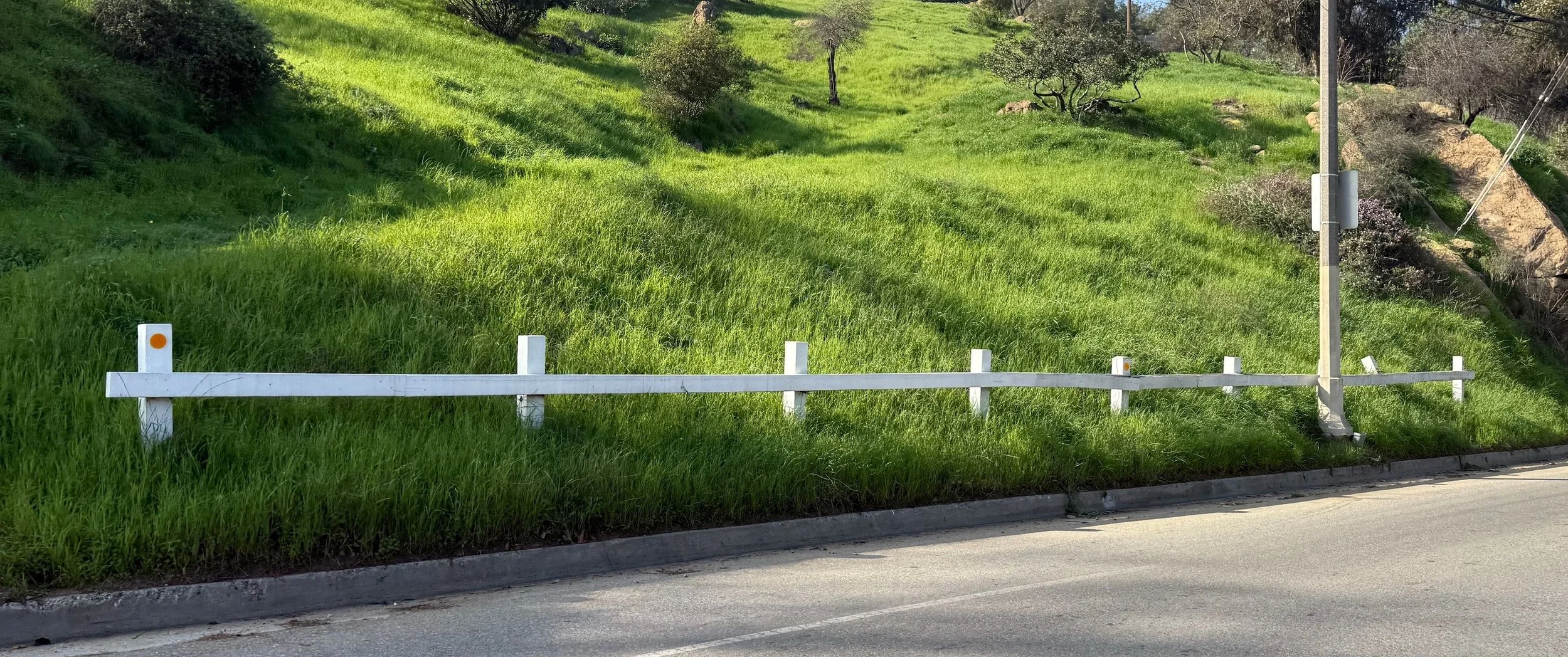 To address this, the City and MRCA are implementing physical safety improvements, recognizing that enforcement alone is not sufficient. Existing plastic bollards already prevent parking in some areas, but gaps remain. The current plan extends protections by installing a low white fence from the end of the existing bollards to the point where the hillside meets the roadway. A 60-foot clear zone for a fire hydrant—required by LAFD—will be maintained, with wheel stops installed within that zone and laid out per LAFD guidance so fire apparatus can safely pull off the road, even on the blind uphill curve.