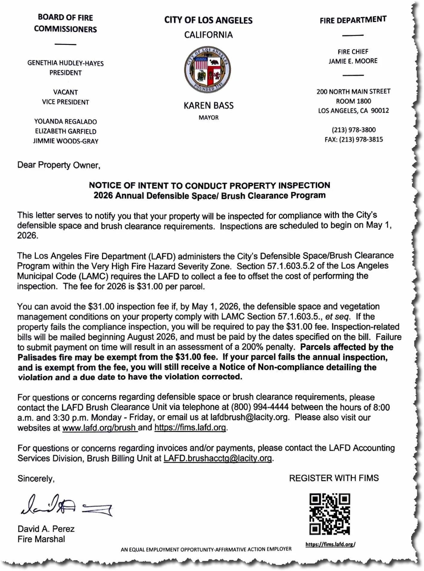 The LAFD has an online system where you can register and monitor the brush clearance status of your property throughout the year. Register at https://fims.lafd.org using the APN (Assessor Parcel Number) and PIN printed on the mailer you received. With a registered account you can: