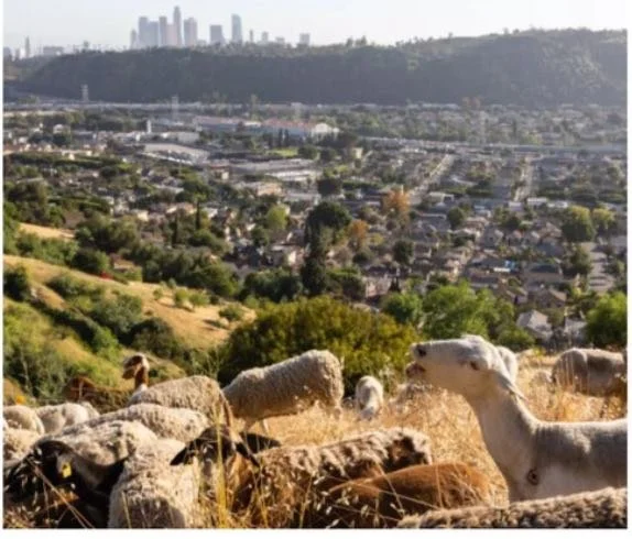 Picture of goats clearing brush on a Los Angeles hillside. Source: https://partygoats.com/brushclearance.html