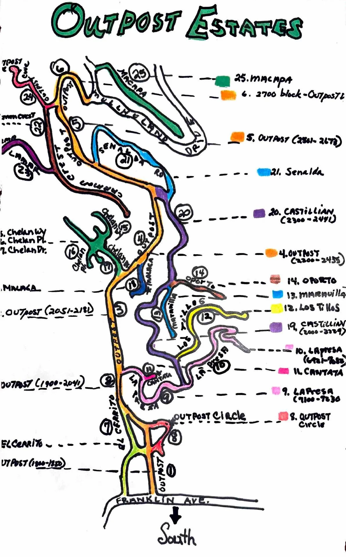 Image of a hand drawn map of Outpost Estates that was referenced in the September 1990 “The Outpost Bugle”