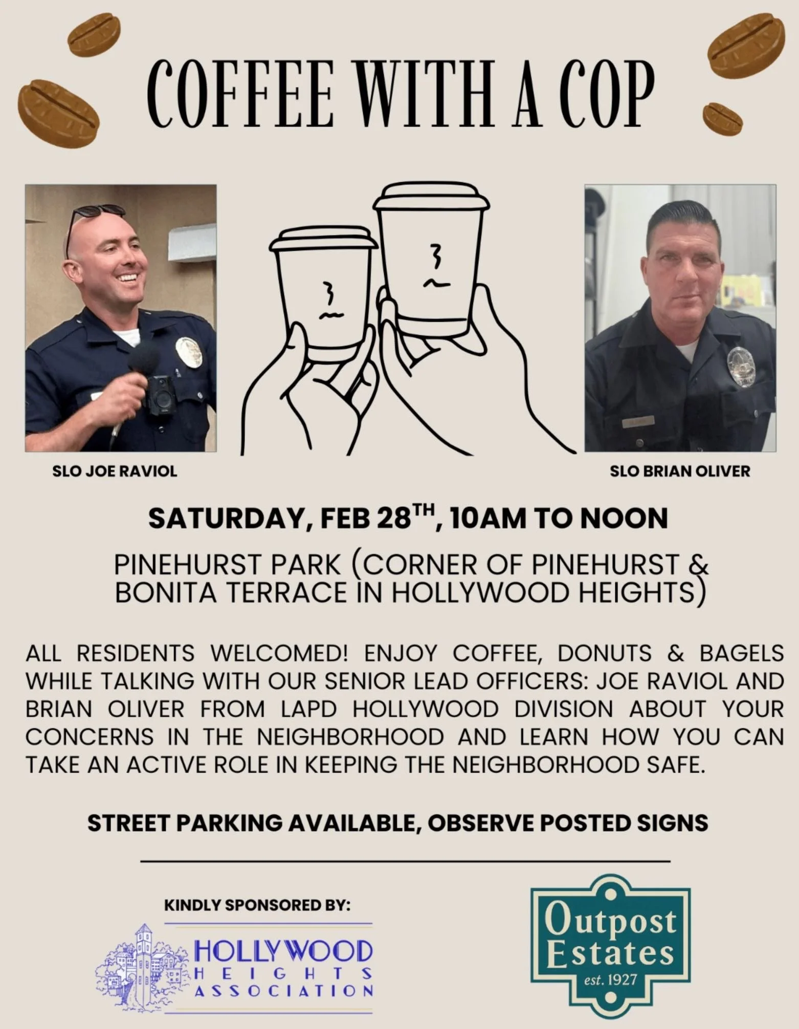 The Los Angeles Police Department (LAPD) Hollywood Patrol Division is hosting a “Coffee with a Cop” event on Saturday, February 28, 2026 from 10am - Noon at Pinehurst Park located at the corner of Pinehurst & Bonita Terrace in Hollywood Heights.