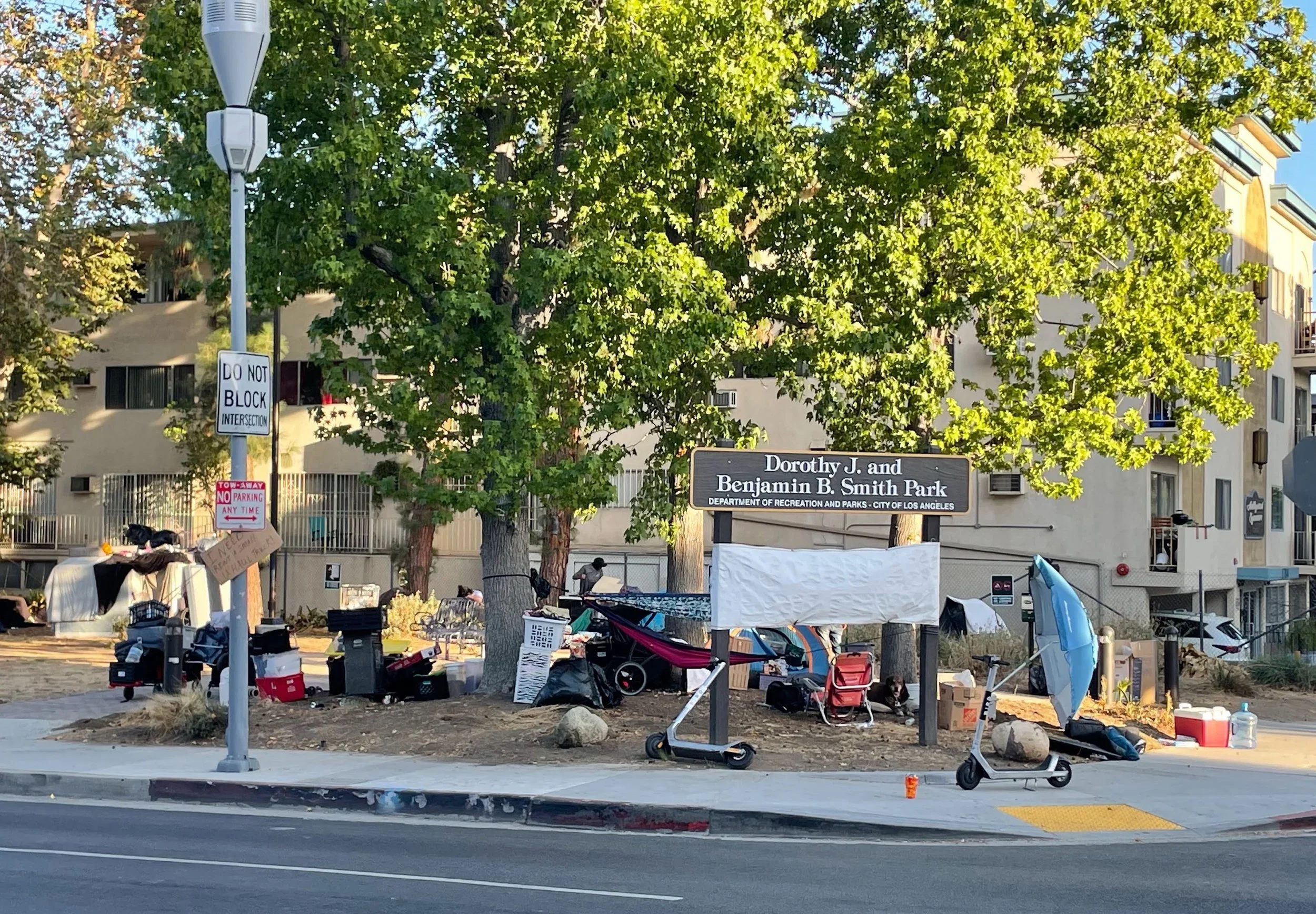 A photo of unhoused camps at the Dorothy J. and Benjamin B. Smith Park from July 2022.